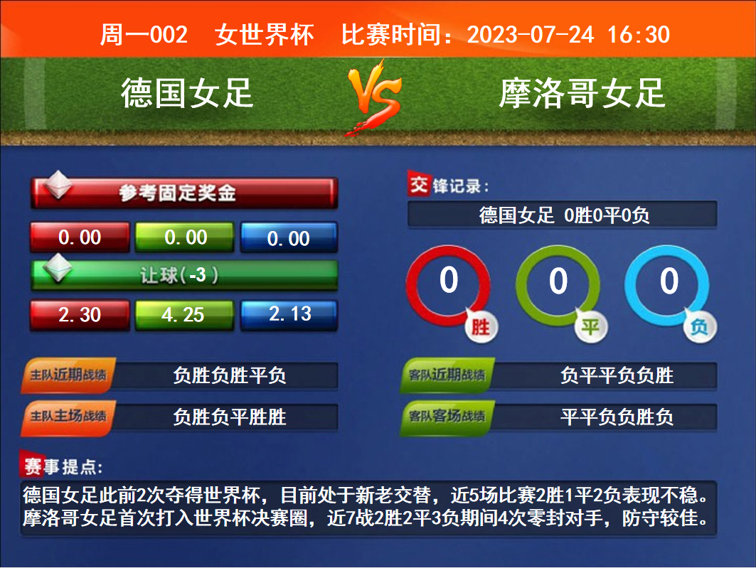 比賽時(shí)間:2023-07-24 16:30賽事提點(diǎn):德國女足此前2次奪得世界杯,目前處于新老交替,近5場比賽2勝1平2負(fù)表現(xiàn)不穩(wěn)。摩洛哥女足首次打入世界杯決賽圈,近7戰(zhàn)2勝2平3負(fù)期間4次零封對手,防守較佳。