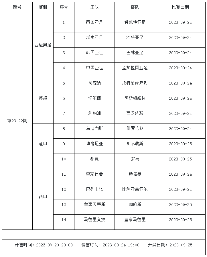 足球彩票勝負游戲(14場和任選9場)第23122期賽程: