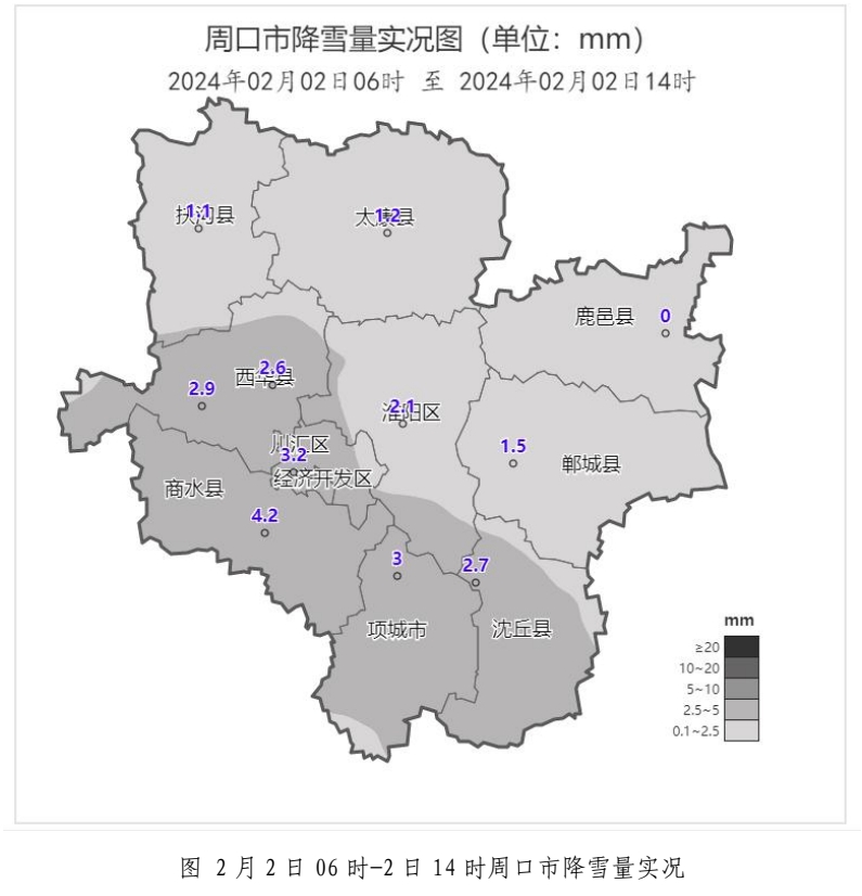 過程累計(jì)雨雪量:1月31日14時(shí)﹣2月2日14時(shí),最大雨雪量出現(xiàn)在扶溝 11.4 毫米,全市平均 7.3 毫米。各國家站累計(jì)雨雪量(毫米):扶溝11.4、沈丘9.8、商水9.1、西華8.4、項(xiàng)城8.2、川匯區(qū)7.6、太康7.5、鄲城7.2、黃泛區(qū)6.7、淮陽6.0、鹿邑5.4。