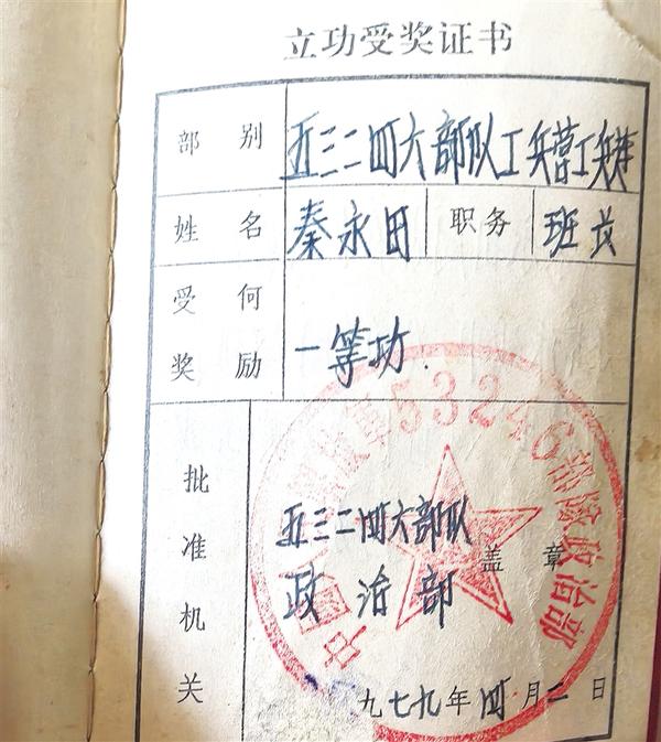 秦永田的立功受獎證書。