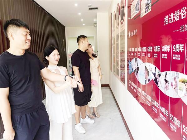 近年來,沈丘縣加大精神文明建設(shè)力度,通過舉辦文化大講堂等活動,在廣大群眾中形成“天價彩禮不可取,鋪張浪費最可恥,陳規(guī)陋習(xí)危害大”的共識,許多年輕人在耳濡目染中受到熏陶,新事新辦蔚然成風(fēng)。圖為8月29日,農(nóng)歷七月初七,結(jié)婚登記的新人在婚史展板前駐足。