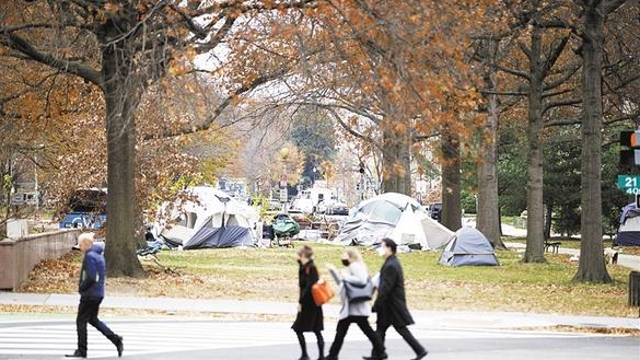 12月8日,在美國(guó)華盛頓,行人經(jīng)過(guò)無(wú)家可歸者居住的帳篷?!?a href="http://www.fanwenbi.com/content/2021-12/11/content_962080.html" target="_blank" >[詳細(xì)]