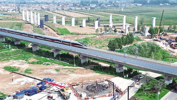 9月16日上午,建設(shè)中的項城通濟大道橋臥波于沙潁河之上,貨船從30米寬的通航孔緩緩馳過,保障豫貨出海。