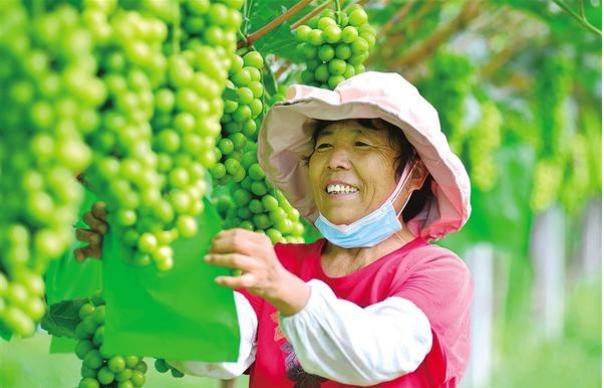 日前,位于鄲城縣錢店鎮(zhèn)的尚葡農(nóng)業(yè)科技園內(nèi)碩果累累,精細化管理帶來葡萄大豐收。圖為一名工作人員看著即將收獲的葡萄笑逐顏開。