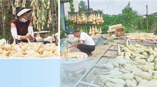 8月13日,在鹿邑縣高集鄉(xiāng)王屯村,村民正忙著清洗、晾曬文玩葫蘆,形態(tài)各異的葫蘆經(jīng)過精加工后身價倍增。