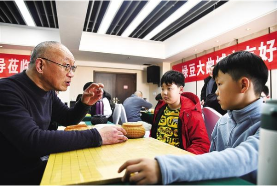 11月22日上午,一位老棋手同時對弈兩個娃娃棋手,幫助娃娃們提高棋藝。當日,在河南省圍棋協(xié)會的支持下,由周口市圍棋協(xié)會主辦的“鄭州、南陽、周口三市圍棋交流賽”在周口舉行。