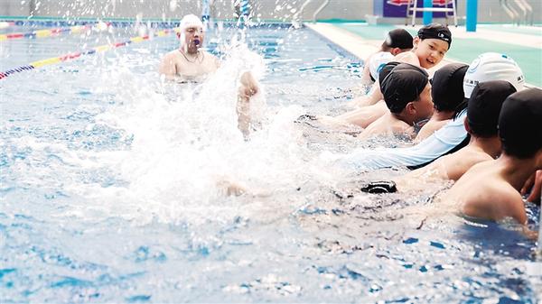 學生在教練的指導下進行游泳訓練。近日,項城市清華育英學校將防溺水課堂“搬”進游泳館,開展“沉浸式”防溺水安全教育活動。