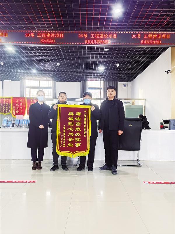 近日,太康縣某置業(yè)公司相關(guān)負責(zé)人將一面印有“廉潔高效辦實事 真誠貼心為企業(yè)”字樣的錦旗送到縣自然資源局,感謝工作人員為他們提供優(yōu)質(zhì)、高效、熱情的服務(wù)。
