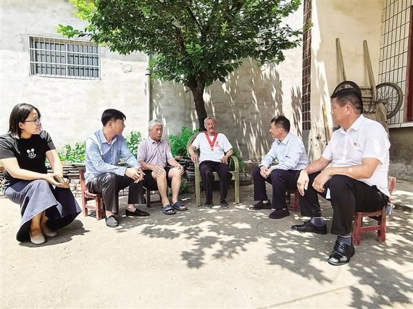 7月1日,沈丘縣付井鎮(zhèn)老黨員楊井明(右三)佩戴“光榮在黨50年”紀(jì)念章,為前來(lái)看望他的鎮(zhèn)村黨員干部講黨史。據(jù)了解,1968年7月1日,楊井明正式成為一名中國(guó)共產(chǎn)黨黨員。