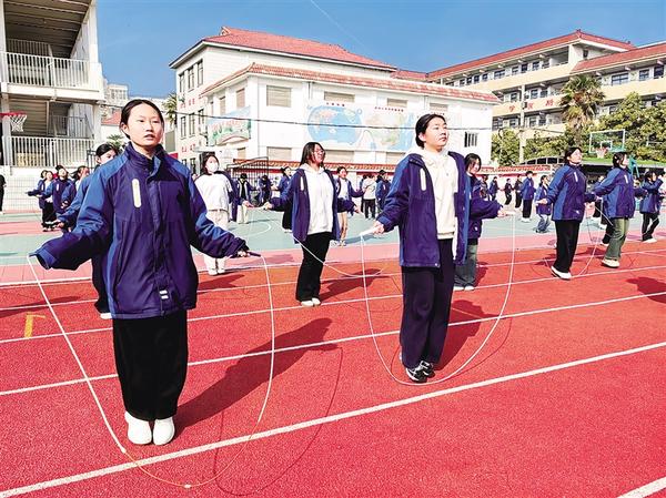 2月26日,周口市第十九初級中學九年級學生在大課間跳繩。從2025年春季學期起,我市全面推動義務教育階段學校每天開展兩小時綜合體育活動。
