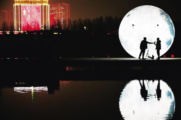 1月18日晚,兩名青年站在引黃調(diào)蓄湖邊的“月亮”前開心地唱歌,表達對新年的期盼之情。