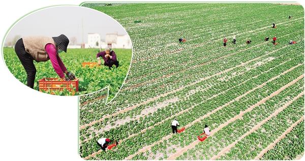 近年來(lái),我市積極推廣“合作社+農(nóng)戶”“家庭農(nóng)場(chǎng)+農(nóng)戶”經(jīng)營(yíng)模式,鼓勵(lì)農(nóng)民通過(guò)土地流轉(zhuǎn)將分散耕地整合起來(lái),實(shí)現(xiàn)集中化、規(guī)?;?jīng)營(yíng),全力提高土地利用效率,為鄉(xiāng)村振興注入強(qiáng)勁動(dòng)力。圖為4月11日,在淮陽(yáng)區(qū)王店街道范莊行政村的農(nóng)田里,村民正采收蔬菜。