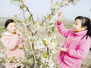 4月12日,商水縣舒莊鄉(xiāng)北王張村的小學生在自家的梨園為梨花授粉。星期天,該村的小學生紛紛跑到梨園欣賞盛開的梨花,幫助家長為梨花授粉,享受著在梨花中勞動的樂趣。