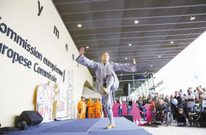 “中國(guó)角”首次現(xiàn)身歐盟開放日 5月9日,在比利時(shí)首都布魯塞爾歐盟委員會(huì)大樓下,中國(guó)武僧表演功夫。當(dāng)日是歐盟一年一度的開放日。因今年恰逢中歐建交40周年,中國(guó)成為歐盟成員國(guó)外唯一一個(gè)開設(shè)宣傳角的國(guó)家,也是1993年歐盟舉辦開放日以來(lái)中國(guó)首次參加,為今年的開放日增添了不少中國(guó)元素。新華社發(fā)