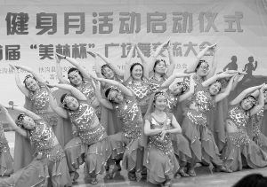 5月10日上午,扶溝縣一女子代表隊(duì)在臺(tái)上表演舞蹈。當(dāng)日,扶溝縣2015年健身月啟動(dòng)儀式暨廣場(chǎng)舞交流大會(huì)拉開帷幕。來自全縣各鄉(xiāng)鎮(zhèn)巾幗代表隊(duì)依次走上舞臺(tái),展現(xiàn)其優(yōu)美的舞姿。在接下來的一個(gè)月里,該縣還將聯(lián)合各類體育協(xié)會(huì)在城區(qū)開展武術(shù)、跆拳道等體育活動(dòng)。盧付昌 申蘭霞 攝