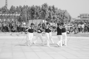 為進(jìn)一步推動全民健身活動的深入開展,項城市啟動了“全民健身月”活動,讓市民積極投身到全民健身行列中,努力使體育鍛煉經(jīng)?;€人健身生活化。圖為5月18日項城市鞭陀協(xié)會的會員正在進(jìn)行鞭陀健身展演。