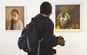 “交錯與融合”美術(shù)作品展在南非開幕      6月6日,在南非約翰內(nèi)斯堡舉行的“交錯與融合”美術(shù)作品展上,一名參觀者欣賞華人藝術(shù)家張銳的油畫作品。當(dāng)日,作為“南非中國年”活動的一部分,由華人藝術(shù)家張銳與南非11名畫家共同參與的“交錯與融合”美術(shù)作品展舉行。新華社發(fā)