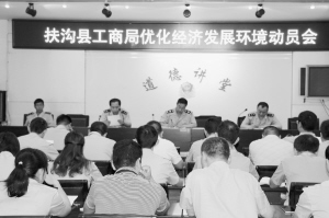 近日,扶溝縣工商局召開優(yōu)化經(jīng)濟(jì)發(fā)展環(huán)境動(dòng)員會(huì),要求全系統(tǒng)工作人員立足工商職能,多措并舉優(yōu)化經(jīng)濟(jì)發(fā)展環(huán)境,為全縣經(jīng)濟(jì)發(fā)展注入正能量。盧付昌 攝