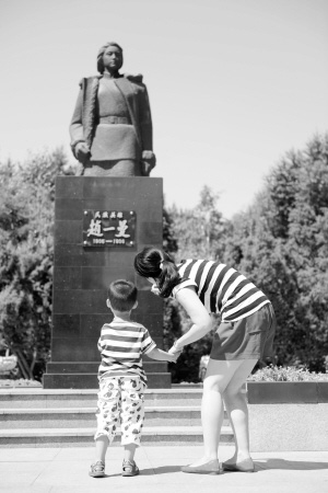 7月5日,在哈爾濱東北烈士紀(jì)念館旁的烈士廣場,一名母親為孩子講述民族英雄趙一曼的英勇事跡。在“七七事變”紀(jì)念日即將到來之際,眾多游客來到哈爾濱東北烈士紀(jì)念館參觀,接受愛國主義教育。右圖為一名訪客在哈爾濱東北烈士紀(jì)念館內(nèi)參觀記錄。新華社記者 王凱 攝