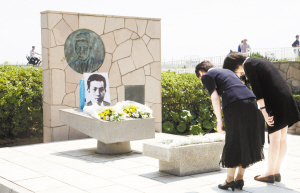 聶耳逝世80周年紀(jì)念活動在日舉行 7月11日,在日本神奈川縣藤澤市鵠沼海岸,參加活動的日本友好人士向聶耳紀(jì)念碑獻(xiàn)花并鞠躬。為紀(jì)念人民作曲家聶耳逝世80周年,中國駐日本大使館和東京都日中友協(xié)當(dāng)天在位于鵠沼海岸的聶耳紀(jì)念碑前舉行紀(jì)念活動。包括日本友好人士、藤澤市政府和市民代表、在日華僑華人等150人聚集在紀(jì)念碑前,共同追思聶耳。新華社發(fā)